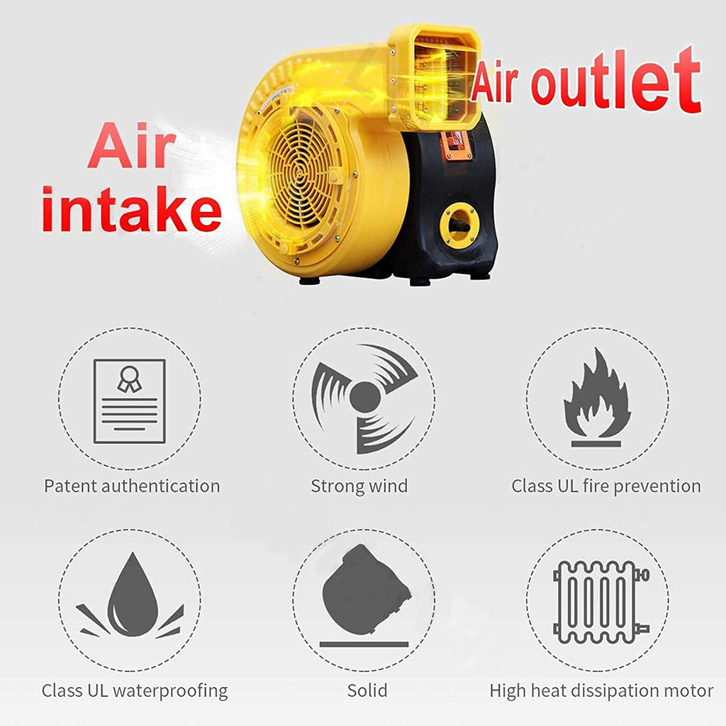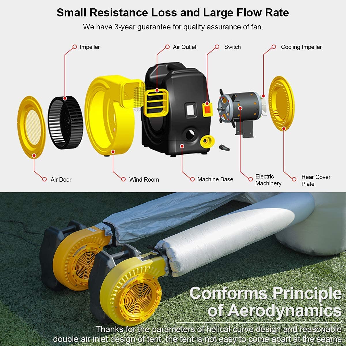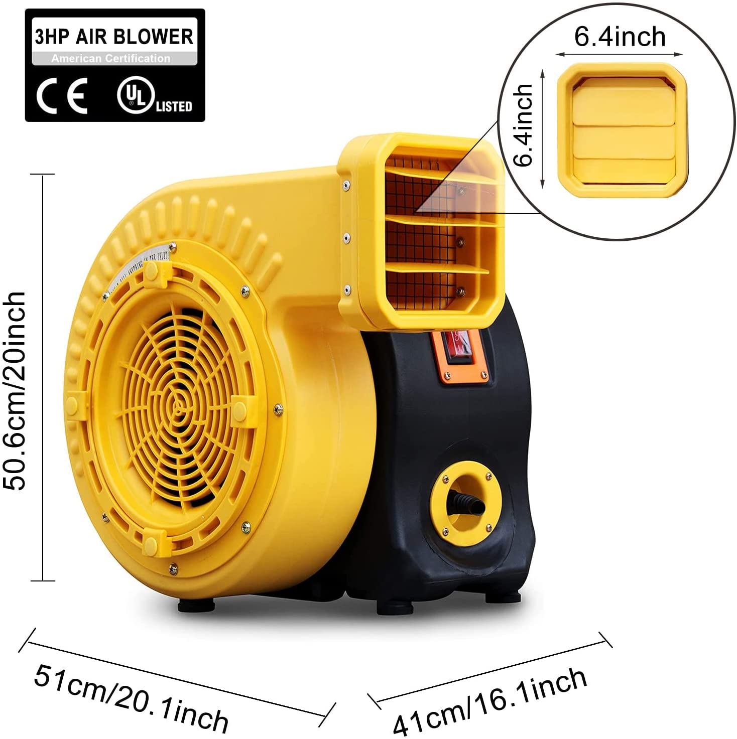 【More Faster Inflation】The inflatable blower with 3hp, 2150 watt motor and exclusively designed impellers, quickly filling and greatly air flowing. It works well with inflatable paint booth, outdoor bounce houses, jumper, obstacle courses, water slides and other suitable inflatables.